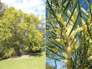 Brigalow - Hardy farm tree reaching 20m suited to windbreaks - dense bluish grey foliage - bright yellow racemes of flrs - frost and drought resistant - suitable for poorly drained soils. (Descriptive label only)