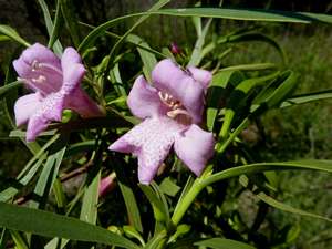 Fast growing shrub - long narrow green leaves - large dark purple spotted flowers occur much of the year - frost and drought tolerant. 5m x 3m