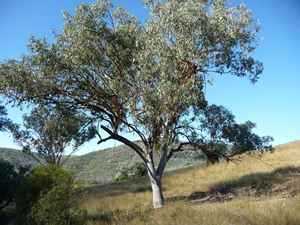 River Red Gum - magnificent spreading tree reaching 30 m - pendulous bluish foliage and smooth white grey trunk - hardy to frost and poorly drained soils.