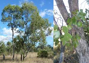 Carbeen - hardy handsome tree growing to 15 m - smooth cream bark on upper trunk above dark tessellated bark at base - tolerant of clay and saline soils - frost resistant.