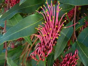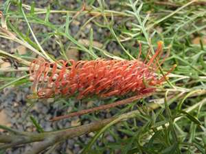 Shrub to 1 m tall - soft grey foliage with linear leaves - waxy red spider flrs in Wi & Sp - frost & drought resistant.