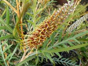 Yellow Tails - Short-lived perennial from inland Australia - green fleshy leaves - buff yellow conical flrs lengthening to 20 cm long cylindrical spikes - grows in loamy well-drained soils - withstands light frosts. m1>Descriptive label only
