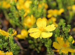 Dainty ground cover spreading to 1m - tiny dark green glossy leaves - large buttercup yellow flrs in Sp & Su - sun or part shade - frost resistant.