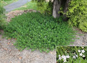 Neat totally flat ground cover - small purplish leaves - white spotted flrs Sp-Su - frost resistant - tolerates wet conditions.