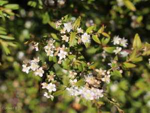 Forest Phebalium - Shrub originating from the New England Tableland and Granite Belt districts - green stem clasping leaves - terminal heads of white flrs with prominent yellow anthers occur in Sp & Su - moderate frost tolerance. 2.5m Descriptive label only