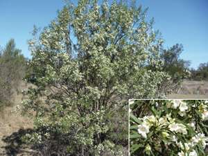 False Sandalwood - Very common in its natural habitat, a hardy suckering shrub – narrow green leaves – masses of cream trumpet shaped flrs in Sp & Su – requires minimal pruning – tolerant of heavy clay, drought & frost. 6m