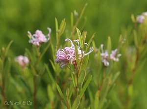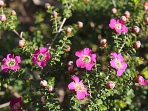 Shrub to 2m - typical tea-tree type foliage - large pink flrs in Wi & Sp - frost resistant.