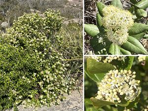 Shrub growing in moist situation - deep green crenulated leaves, white underneath - cream flrs in Sp - frost tolerant. 2.5m Descriptive label only